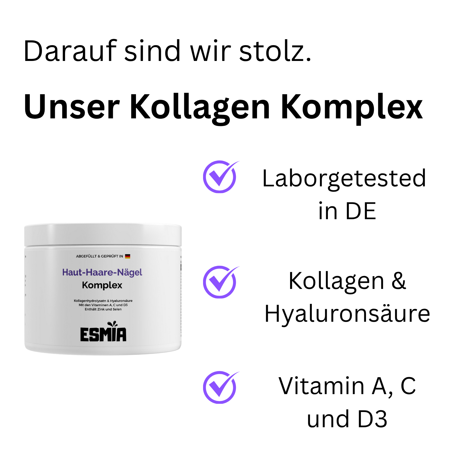 Der Haut-Haare-Nägel Komplex von Esmia ist ein hochwertiges Nahrungsergänzungsmittel, das speziell entwickelt wurde, um deine natürliche Schönheit von innen heraus zu unterstützen.
