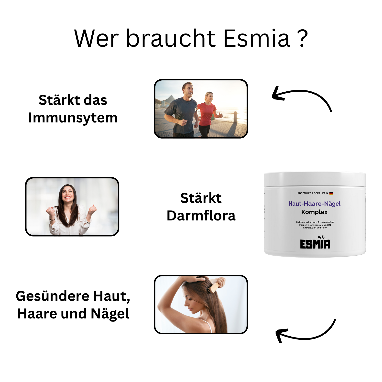 Die regelmäßige Anwendung des Esmia Haut-Haare-Nägel Komplexes kann helfen, die natürliche Schönheit zu fördern, das Bindegewebe zu stärken und das allgemeine Wohlbefinden zu verbessern – für ein strahlendes Erscheinungsbild von innen heraus.