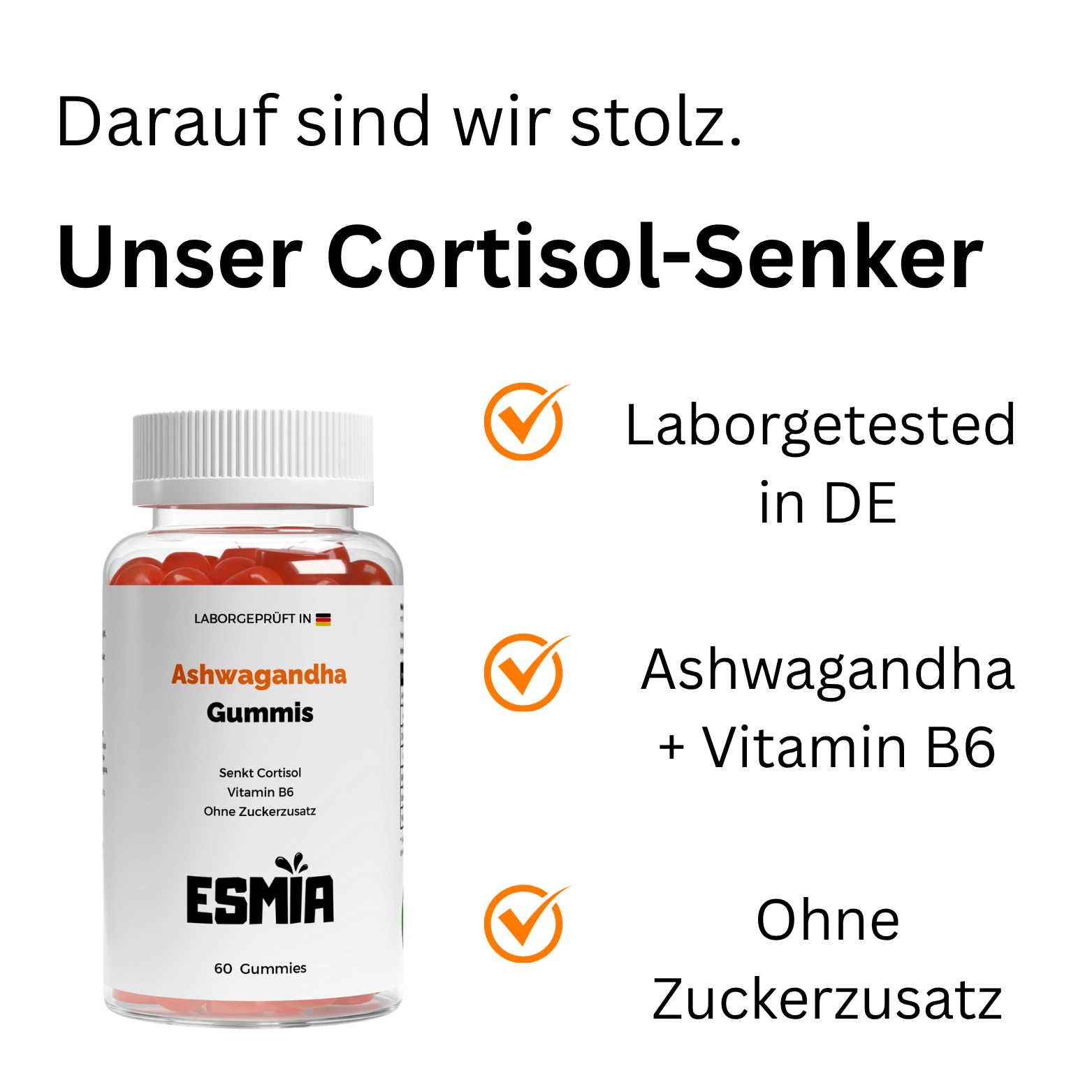 Ashwagandha ist bekannt dafür, das Stresshormon Cortisol zu senken, wodurch der Körper besser entspannen kann. Ein niedriger Cortisolspiegel kann helfen, besseren Schlaf, mehr Ruhe, weniger innere Unruhe und ausgeglichenere Stimmung zu fördern.