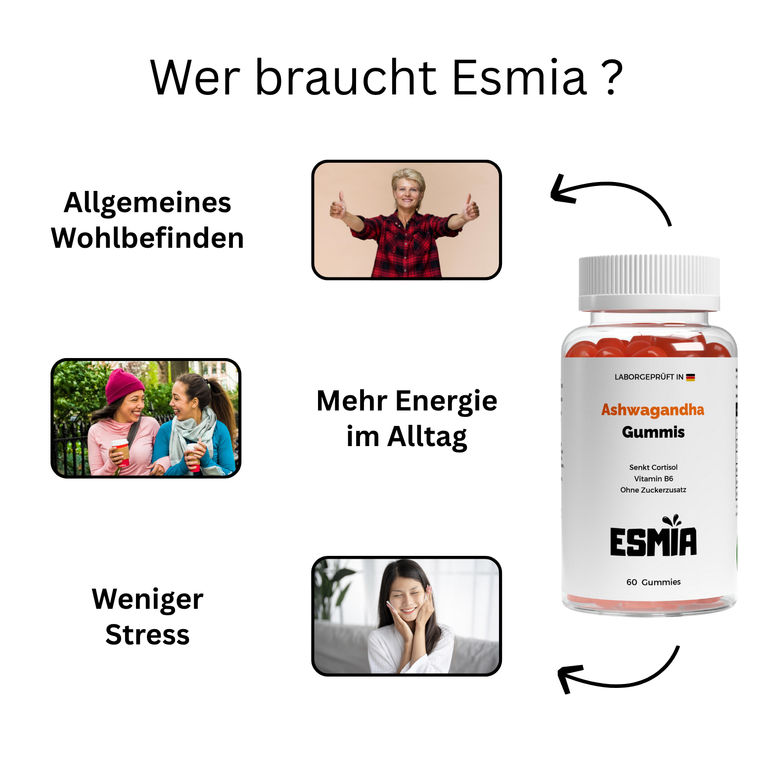 Die Ashwagandha Gummis von Esmia sind vegane, zuckerfreie Nahrungsergänzungsmittel, die auf natürliche Weise dabei helfen, Ruhe, Ausgeglichenheit und innere Balance zu fördern.