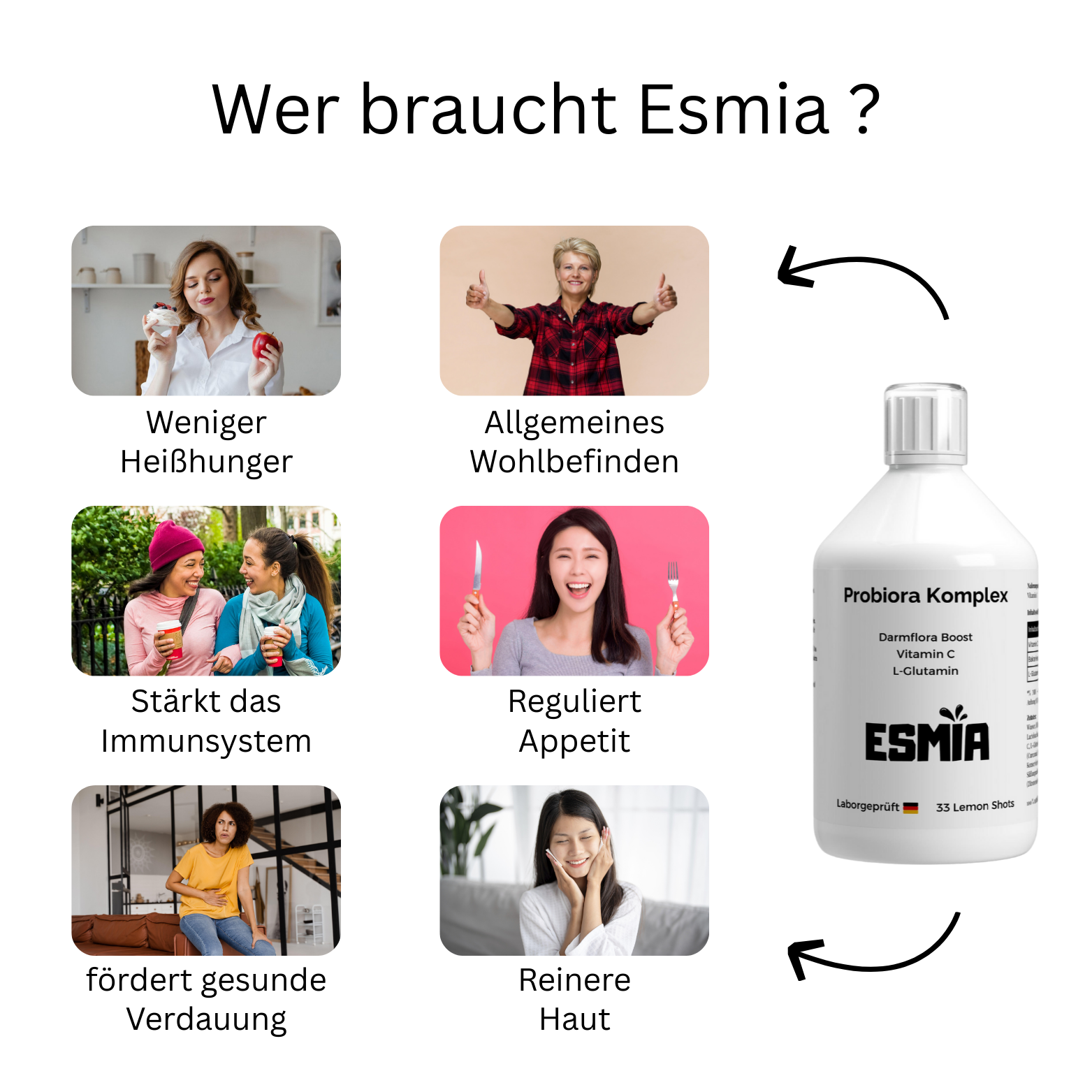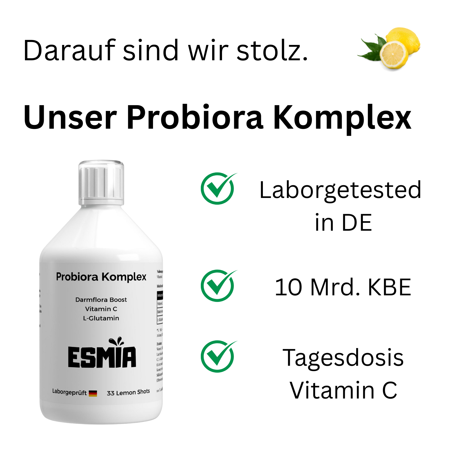 Es ist natürlich jedem selbst überlassen, zwischen den verschiedenen Anbietern von Probiotika zu wählen, doch der Probiora Komplex von Esmia bietet einige herausragende Vorteile, die ihn besonders attraktiv machen. Neben den vier hochwertigen Bakterienstämmen, die eine gesunde Darmflora fördern und die Verdauung unterstützen, enthält der Komplex auch den täglichen Vitamin C-Bedarf, der für das Immunsystem und die Hautgesundheit von Bedeutung ist. Besonders hervorzuheben ist der Wirkstoff L-Glutamin, der nicht nur beim Abnehmen unterstützen kann, sondern auch zur Förderung einer klaren und gesunden Haut beiträgt. Durch diese einzigartige Kombination bietet der Esmia Probiora Komplex eine umfassende Unterstützung für den Körper, die über die bloße Darmgesundheit hinausgeht und zahlreiche weitere positive Effekte auf das allgemeine Wohlbefinden hat. Der Probiora Komplex von Esmia ist also kein Wundermittel, sondern dient mit seinen zahlreichen positiven Effekten dazu, dich auf deinem Weg zu unterstützen!
